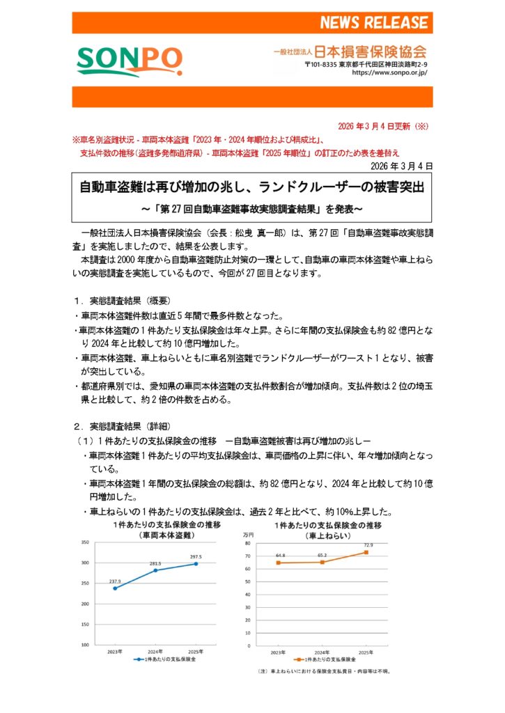 このたび、自動車盗難事故実態調査の結果が発表され、全国的に自動車盗難被害が発生している状況が改めて確認されました。