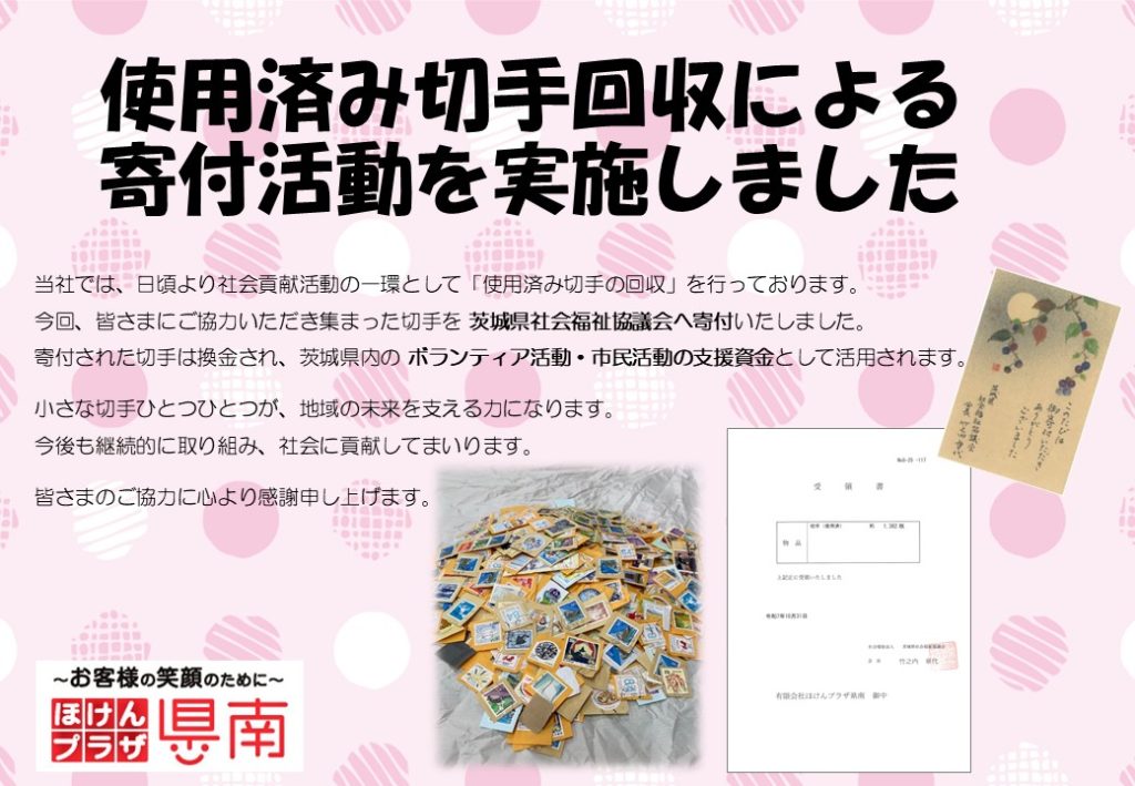 当社で社会貢献活動の一環として使用済み切手の回収を行い、このたび茨城県社会福祉協議会へ寄付いたしました。 寄付分は換金され、茨城県内におけるボランティア活動・市民活動の助成に活用されます。 日々の業務の中で無理なく取り組める社会貢献として、社員の意識向上にもつながる活動となりました。 継続的に回収・寄付を続けていく予定です。